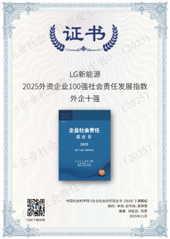 11月20日-21日,由中国企业改革与发展研究会主办的第八届北京责任展在京举办并发布了《企业社会责任蓝皮书(2025)》。凭借推动绿色低碳发展、构建可持续未来方面的杰出贡献,LG新能源再创佳绩,不仅连续五年稳居“动力电池行业社会责任发展指数(2025)”首席,并首次进入“外资企业100强社会责任发展指数(2025)”十强。同期,在峰会上,LG新能源发布的《LG新能源(中国)2025环境、社会及管治(ESG)报告》(以下简称ESG报告),经中国企业社会责任报告评级专家委员会评级小组综合评价保持五星水平。
