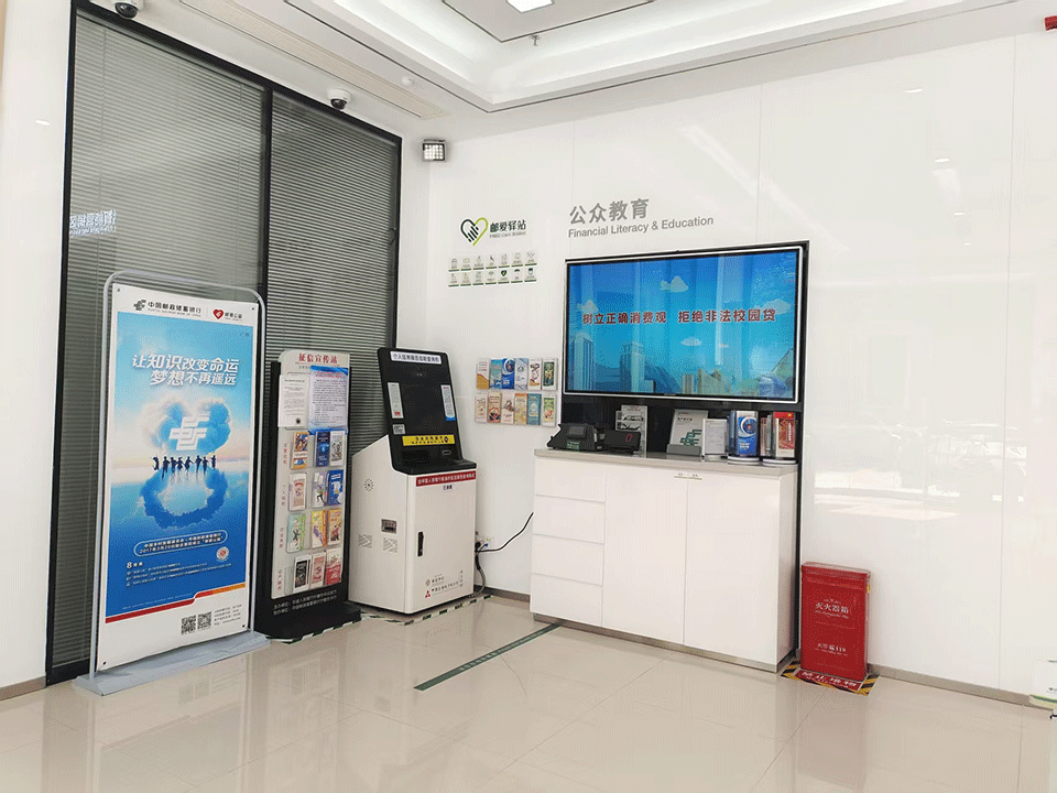 该行在营业网点醒目位置摆放着“邮爱公益”宣传折页、易拉宝,工作人员佩戴定制公益徽章,为办理业务的客户讲述“邮爱公益”故事,弘扬慈善文化。