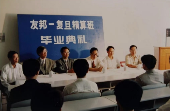 这是一张摄于上世纪90年代的老照片,记录下友邦与复旦大学合作成立“友邦-复旦精算班”后的瞬间,故事也从照片中的小方桌讲起。